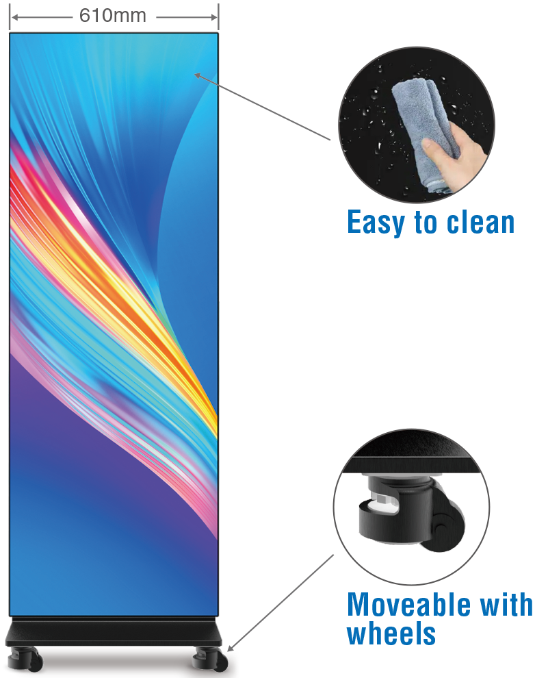 This LED screen features 4 flexible wheels for easy mobility in living rooms, offices, or outdoor events. At just 29.5mm thick, its ultra-thin design fits seamlessly into any space without bulk. The foldable screen body enables compact storage when unused, enhancing portability and practicality.